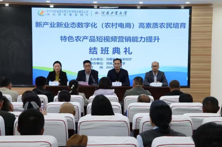 3月31日,由河南省农业农村厅主办、河南工业大学承办的2026年新产业新业态数字化(农村电商)高素质农民培育——特色农产品短视频营销能力提升培训班结班典礼在学校博识楼3428报告厅举行。来自全省的70名农业电商创业者、合作社运营负责人、驻村干部、返乡青年等学员参加典礼。学校教育培训学院院长刘克非、副院长沈贞,管理学院院长李凤廷、副院长李朝阳及培训班工作人员出席结班典礼,仪式由班主任申聪主持。